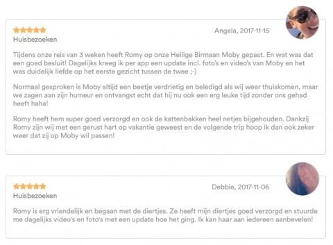 Tijdens je vakantie houdt de oppas je op de hoogte met leuke foto's en verslagen. Je huisdier hoeft nooit meer eenzaam te zijn! Na afloop van de reservering krijg je automatisch een melding van ons: je kunt dan een beoordeling schrijven voor de oppas, zodat andere baasjes ook op weg worden geholpen met het vinden van een oppas.